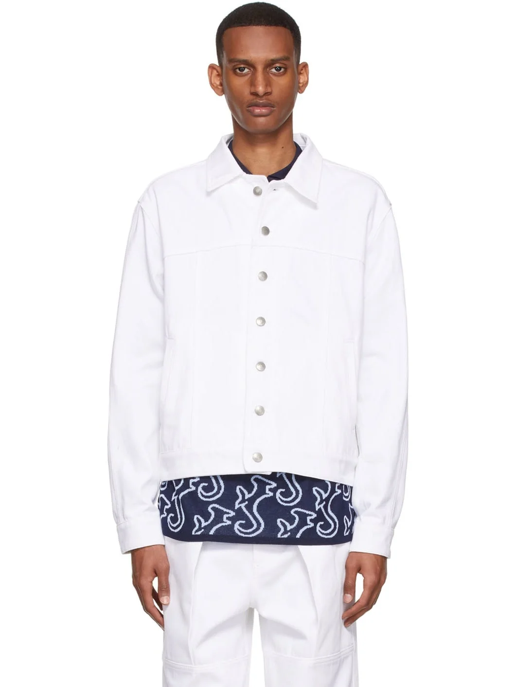 Non-stretch denim jacket. · Spread collar · Button closure · Welt pockets · Single-button barrel cuffs · Embroidered logo patch at back · Adjustable button tabs at back Part of the Let The Sea Resound, And All That Is In It: Part 2 (Hippocampus) collection. Supplier color: White 100% cotton. Made in Greece 221238M177000