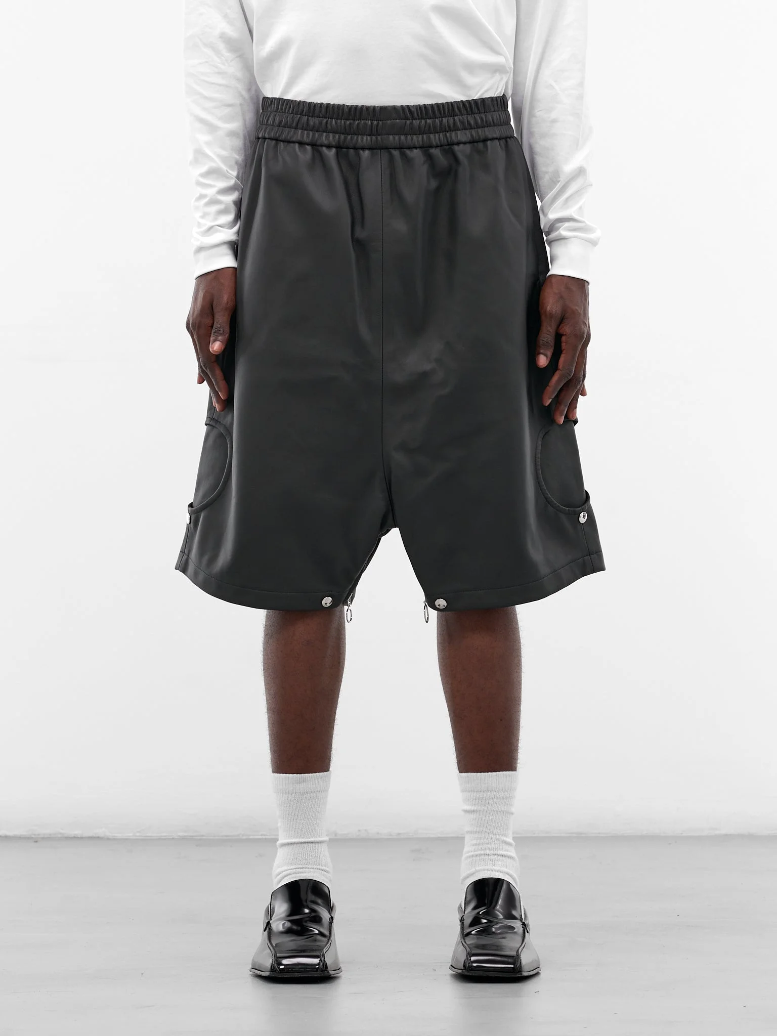 Featuring: • Baggy fit • Wide leg • Knee-length • Elasticated waistband • Side seam and back patch pockets • Side cut-outs and button fastening • Zip vent at crotch • Drop crotch • Made in Italy • 100% Lamb Leather • Japanese sizing Model is 6’2” wearing size 3. Shoulders: 19” Chest: 38” Waist: 28”