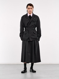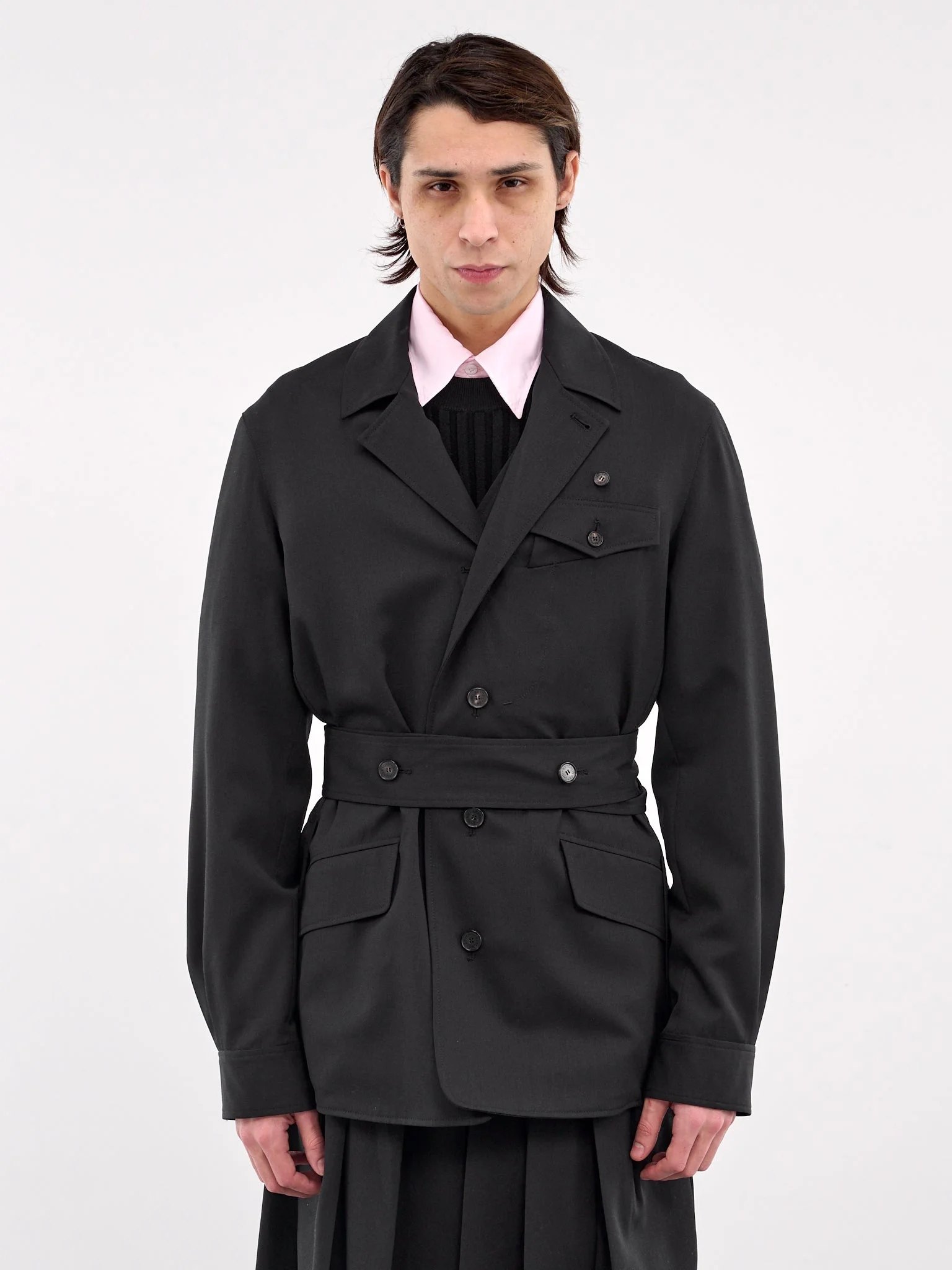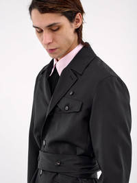 SETCHU jacket in navy, safari jacket design, paneled wool construction, notched lapel, long sleeves, button cuffs, front double-breasted button closure, chest buttoned flap pocket, waist buttoned belt fastening, side flap pockets, straight hem, tailored fit. Made in Italy 100% Virgin Wool Japanese Sizing Model is 6'1” and wears a size 3. Shoulders: 17” Chest: 33” Waist: 30”