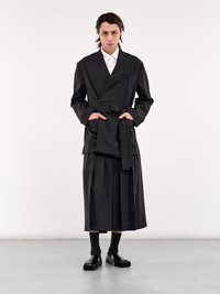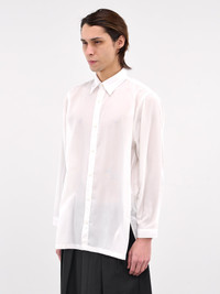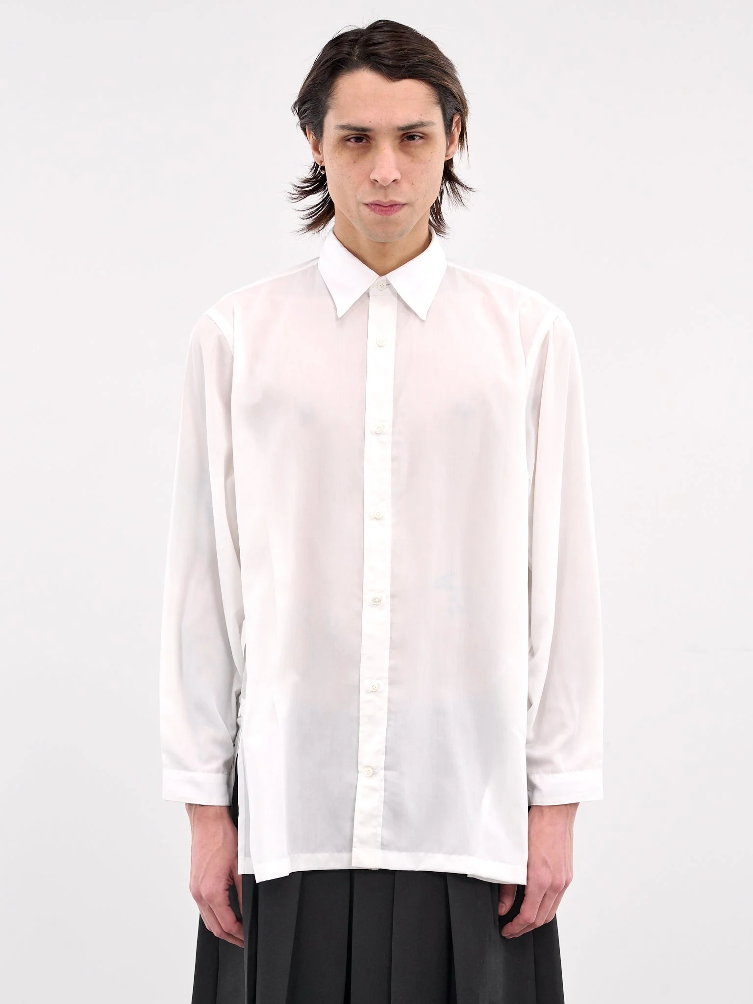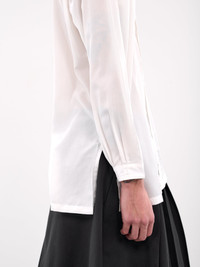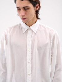 SETCHU shirt in white, paneled poly construction, pointed collar, front button placket closure, long sleeves, button cuffs, straight hem, relaxed fit. Made in Italy 100% Polyester Japanese Sizing Model is 6'1” and wears a size 2. Shoulders: 17” Chest: 33” Waist: 30”