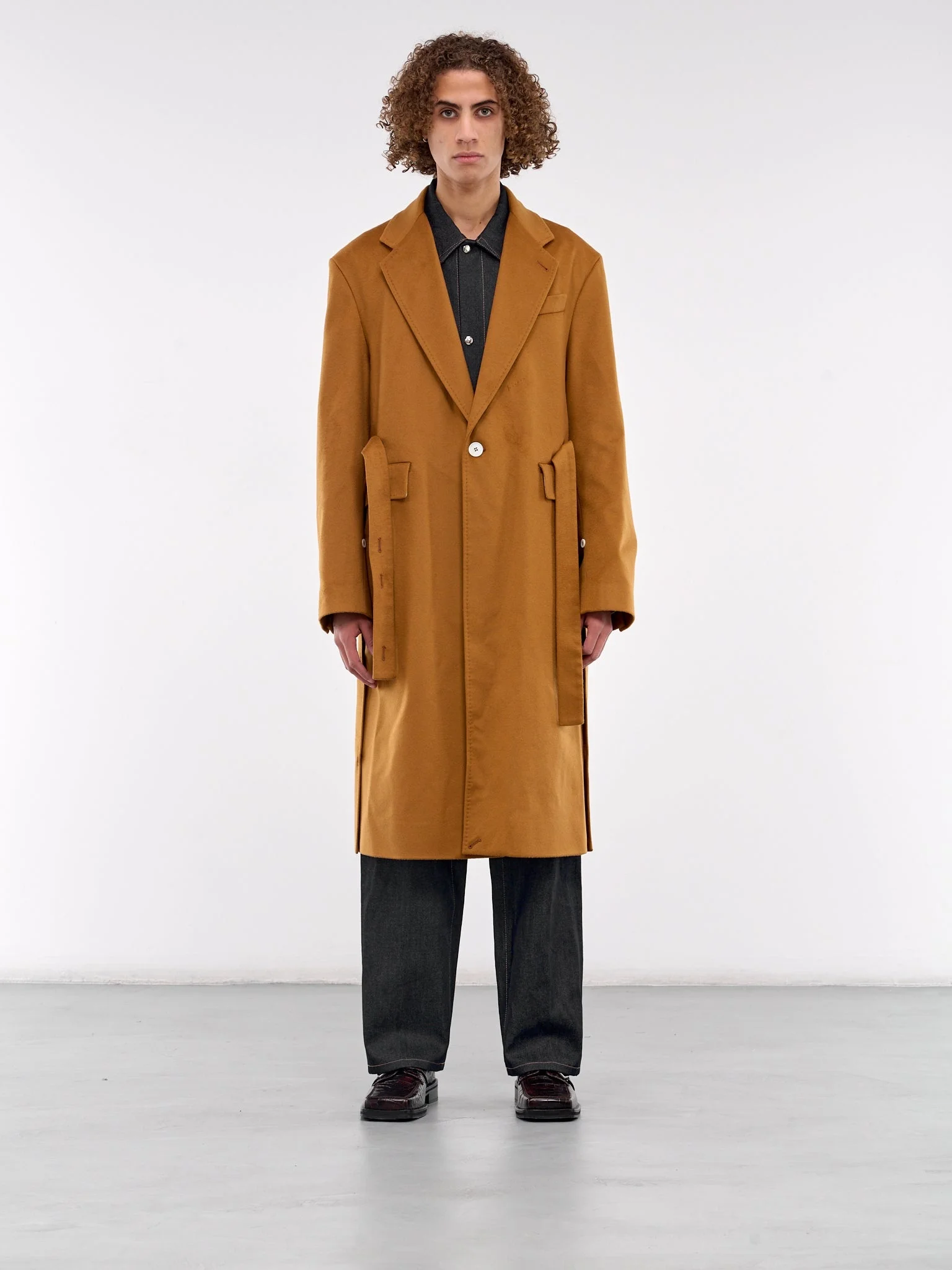 SETCHU coat in cognac, paneled cashmere construction, notched lapel, structured shoulders, long sleeves, surgeon's cuffs, front button closure, chest welt pocket, waist adjustable button strap, side flap pockets, side vents, straight hem, midi-length, tailored fit. Made in Italy 100% Cashmere Numeric Sizing Model is 6'2" wearing size 4. Shoulders: 19" Chest: 38" Waist: 29"