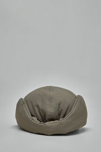 Cap with a padded, panel-stitched crown and foldable side ear flaps. It features a firm, flat brim, matte neutral beige fabric, visible top stitching and small metal snap details. Materials: 100% Nylon Color: stone SKU: 153190 Brand style: A24027