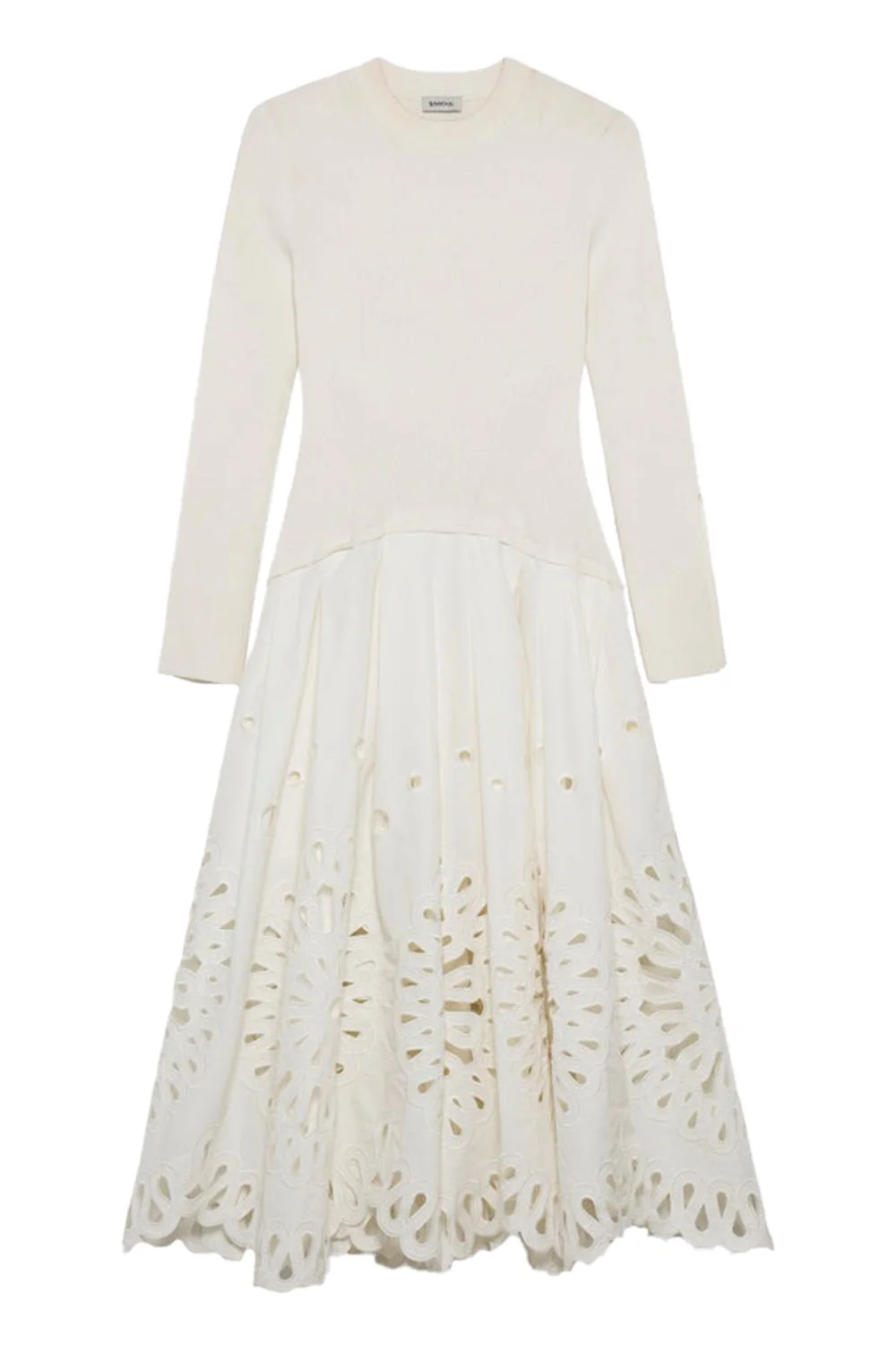 DETAILS AND INSIGHT Simkhai daila midi dress in white. Shell: 71% Recycled Viscose 14% Nylon 14% Polyester 1% Spandex, Contrast: 62% Cotton 38% Polyamide Hand Wash Imported Style 126-1225-BA-WHT