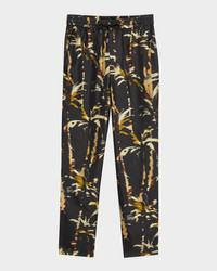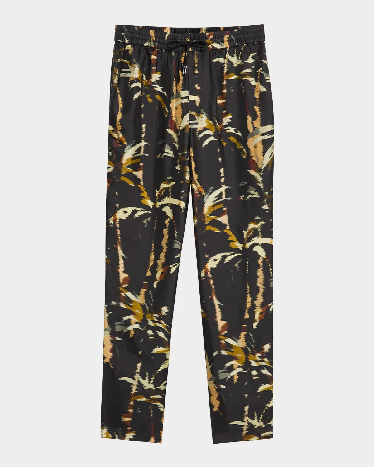 - SIMKHAI "Allister" pants in windswept palm print - Approx. 30" inseam - Elasticized drawstring waist - Side slip pockets - Full length - Relaxed legs - Pull-on style - Silk - Dry clean - Imported