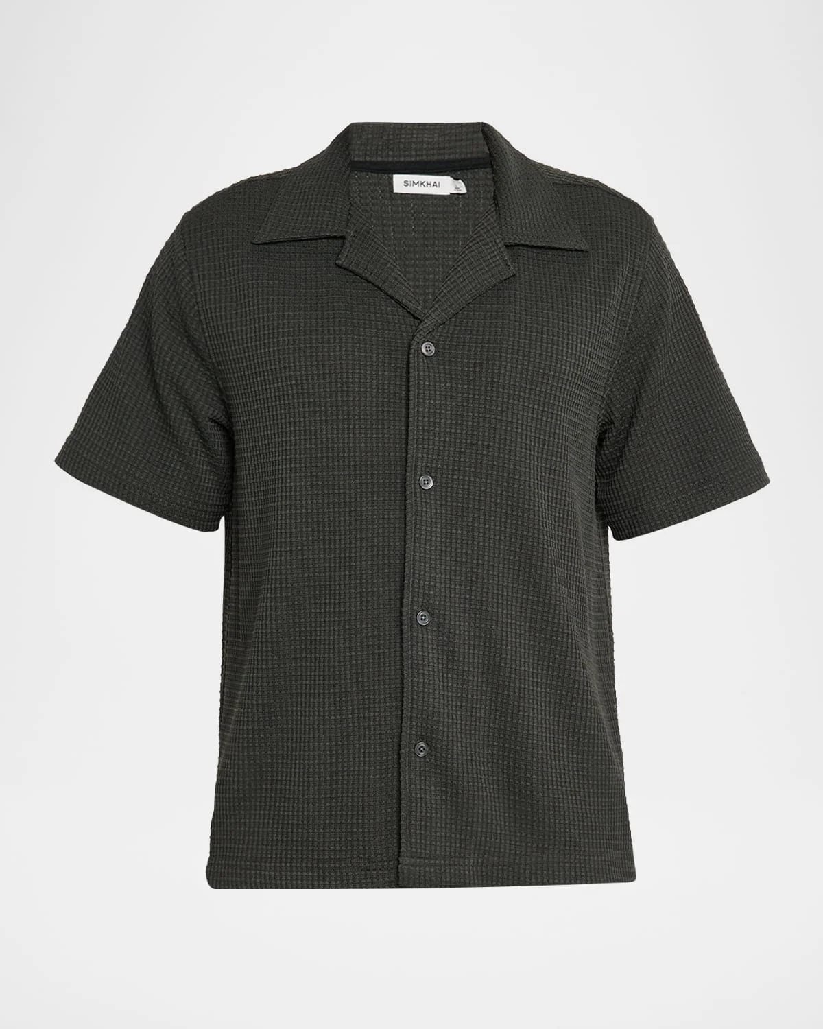 SIMKHAI buttondown shirt in unique textured polyester Notch collar Button front Short sleeves Back yoke Straight hem Classic fit Polyester Dry clean Imported