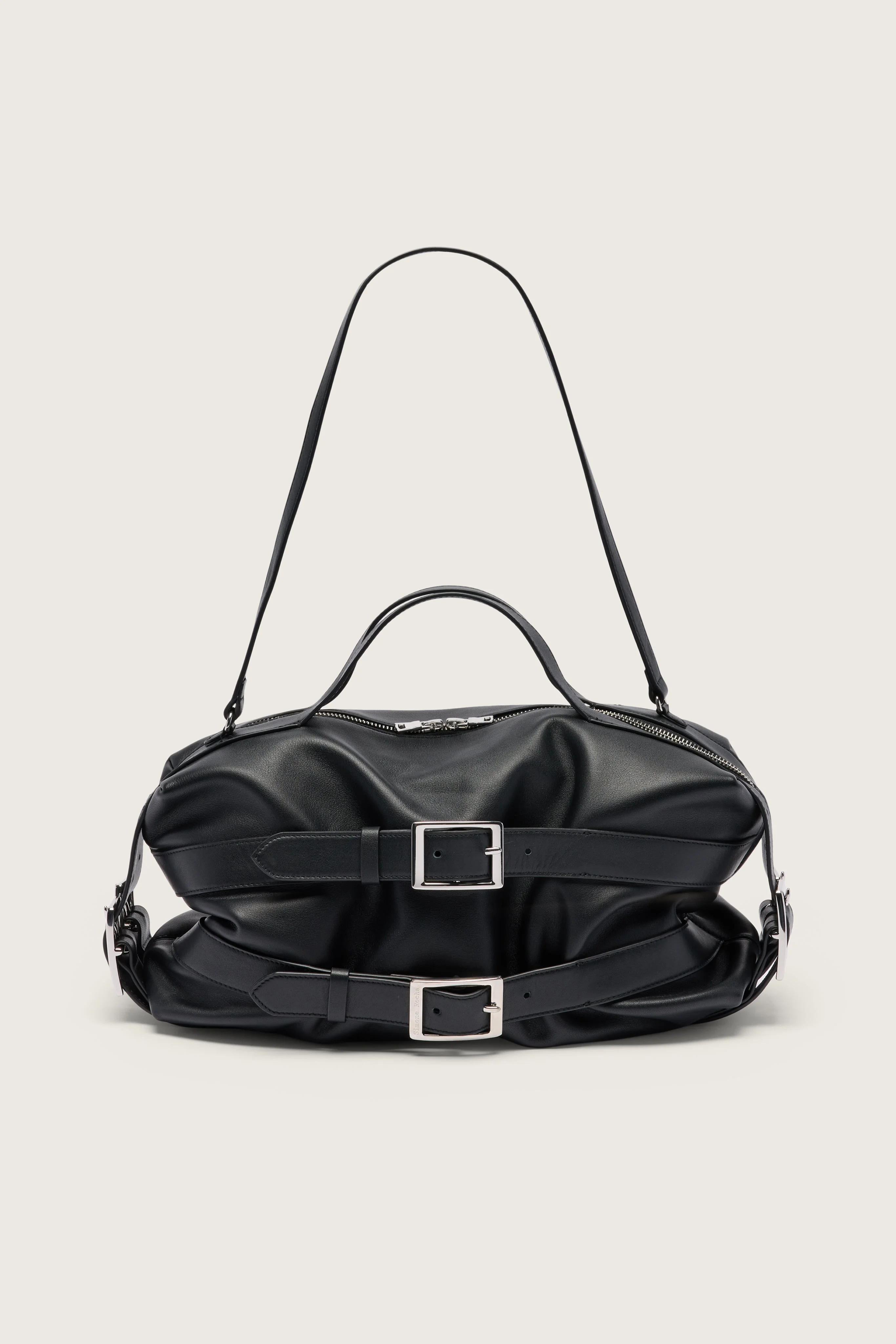 This new duffle bag shape is gathered by two horizontal belt straps at the front that wrap around to give it a relaxed appearance. It features a top handle as well as a longer strap to wear over the shoulder. Product Details Calf leather bag - Belt buckle detail at front and side - Zip closure - Contrasting lining - Silver-tone hardware - Dimensions: 38cm x 12cm x 21cm (Excluding strap) Composition: Outer: 100% Leather Lining: 100% Cotton SKU: BAG203 0809 BLACK