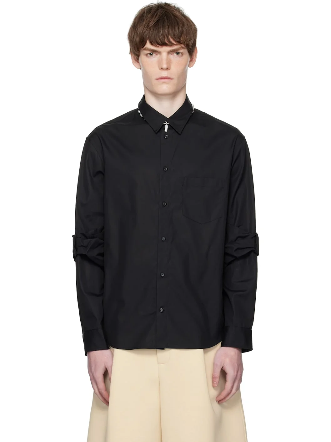Cotton poplin shirt. · Spread collar · Button closure · Patch pocket at chest · Shirttail hem · Bow accent at sleeves · Buttoned barrel cuffs · Box pleat at back yoke Supplier color: Black 100% cotton. Made in Portugal 252405M192013