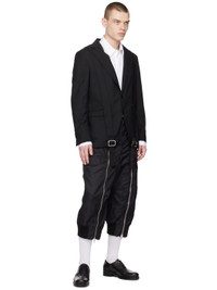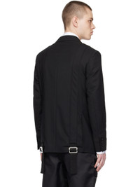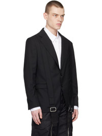 Virgin wool twill blazer. Adjustable webbing cinch straps throughout. · Notched lapel · Two-button closure · Flap pockets · Padded shoulders · Four-button surgeon's cuffs · Welt pockets at interior · Full satin lining Supplier color: Black Body: 100% virgin wool. Trim: 66% cotton, 34% viscose. Lining: 100% viscose. Made in Portugal 231405M195002