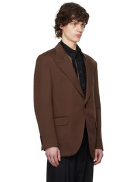 Loose-fit polyester- and wool-blend barathea blazer. · Peaked lapel · Single-button closure · Welt pocket and flap pockets · Four-button surgeon's cuffs · Faux-pearl beaded applique at back collar · Central vent at back hem · Full viscose satin lining Supplier color: Chocolate Body: 55% polyester, 45% virgin wool. Lining: 100% viscose. Made in Portugal 251405M195000
