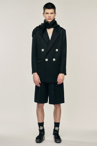 A boxy jacket tailored from a wool blend and has a traditional double-breasted front. The snap buttons are adorned with pearl flowers. The model is wearing this style with the Wide Leg Multi Belt Loop Shorts. Product Details Venetian wool jacket - Signature daisy pearl on back - Faux pearl snap buttons - Double-breasted button closure - Relaxed fit Composition: 45% Virgin Wool 55% Polyester Lining: 100% Viscose (Excluding Embellishment) SKU: 6133DB 1217 CHARCOAL/PEARL Size & Fit Model is wearing size Medium.