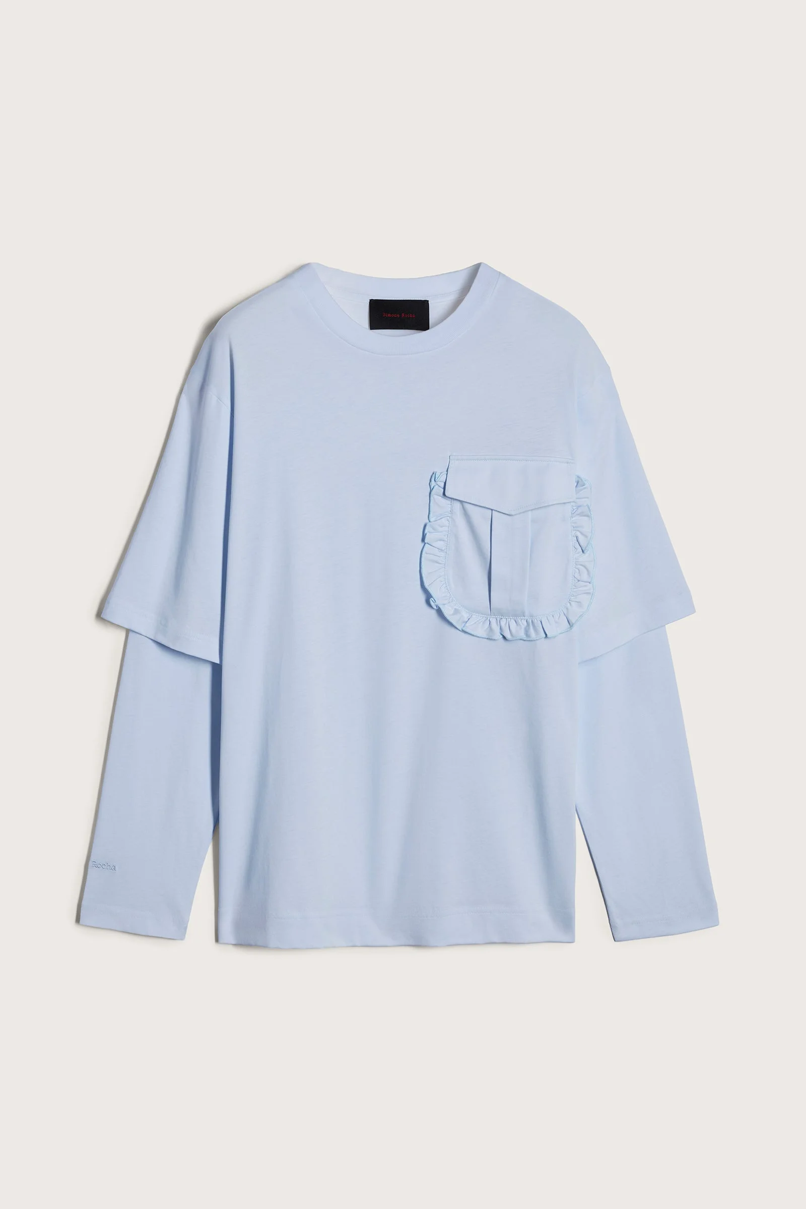 A long sleeve t-shirt with a layered construction, it features an oversized pocket at the chest with ruffle frills. Product Details Cotton jersey long sleeve t-shirt - Layered construction - Ruffle detail flap pocket at front - Embroidered tonal logo at back - Oversized fit Composition: 100% Cotton SKU: 5379 0553 PALE BLUE