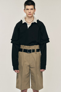 This rugby shirt style features an integrated layered design, this style feature a ruffled should pad detail and a contrasted collar. The model is wearing this style with the Wide Leg Multi Belt Loop Shorts. Product Details Cotton structured jersey rugby shirt - Layered construction - Ruffle detail at shoulder - Contrasting collar - Oversized fit Composition: 100% Cotton Self 2: 100% Cotton Self 3: 100% Nylon Self 4: 95% Synthetic Fibres 5% Polyamide SKU: 5365 1282 BLACK Size & Fit Model is wearing size Small.