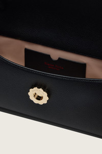 The Valentine bag family has a new member with this elongated style. The style can be worn on the shoulder or as a clutch, it features the signature daisy pearl closure. Product Details Elongated grain leather shoulder bag - New elongated shape - Pearl daisy hardware - Detachable shoulder strap - Inner pocket detail Composition: 100% Leather SKU: BAG190 0787 BLACK