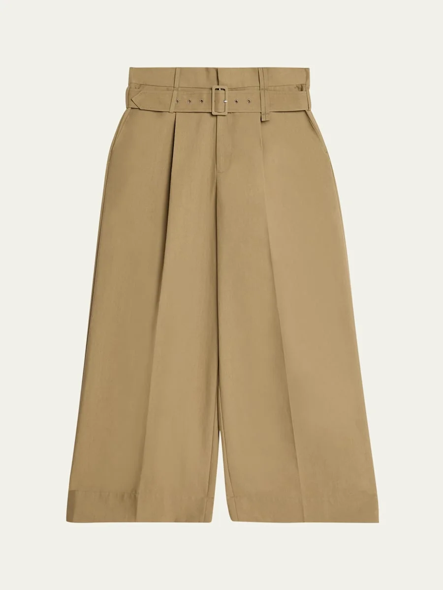 Simone Rocha "Olive" belted pants finished with elongating pleats Regular rise Side seam pockets Back buttoned welt pockets Full length Wide legs Hidden hook/zip fly; belt loops Cotton/nylon/polyamide Made in Portugal Online Inquiries: BGS21_NDPFS| Store Inquiries: #5060810