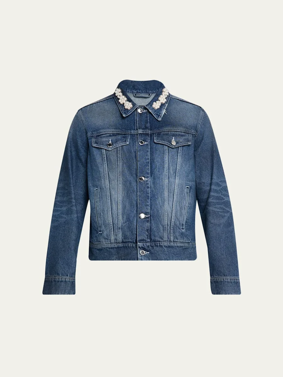 Simone Rocha trucker jacket in denim, highlighted with pearl embellishments on the collar Button front Chest flap pockets Side welt pockets Single-button cuffs Back neck label Hem adjusters Cotton Hand wash or dry clean Made in Portugal Online Inquiries: BGS21_NDMFJ| Store Inquiries: #5048930