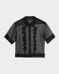 Crafted from sheer organza, this striking Simone Rocha shirt features two vertical rows of ribbon appliques that create a florallike motif. Spread collar Butto front placket Halflength sleeves Oversized fit Silk/polyester Dry clean Made in Portugal