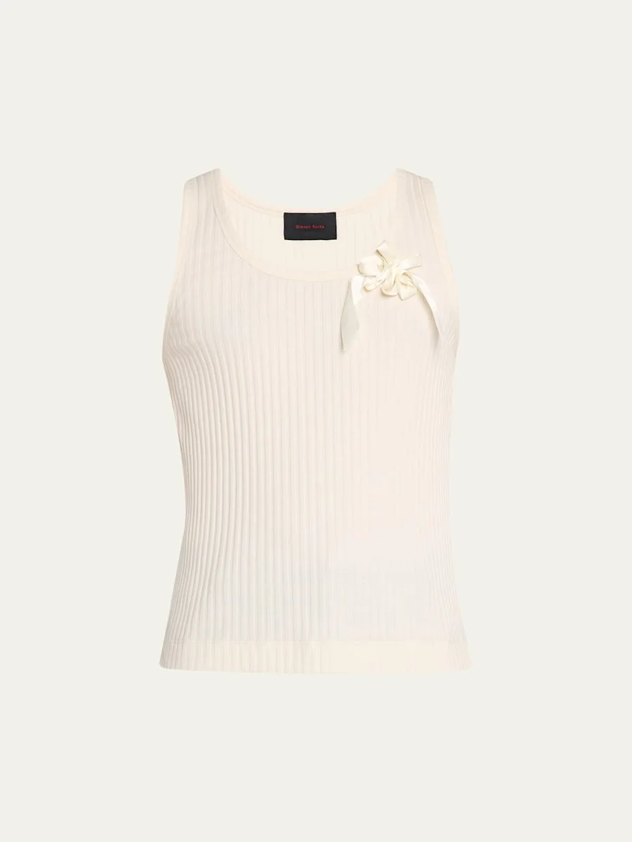 Simone Rocha ribbed shirt, showcasing a ribbon daisy ornament on the chest Rounded neckline Sleeveless Pullover style Cotton/elastane Hand wash or dry clean Made in Portugal Online Inquiries: BGS21_NDMF9| Store Inquiries: #5048921