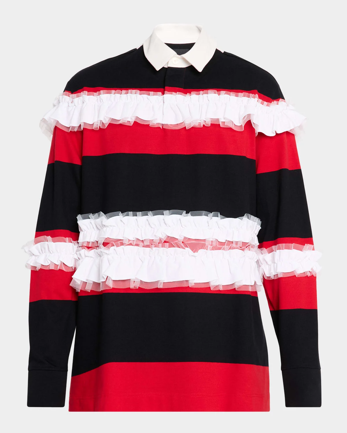 Simone Rocha polo shirt with bold horizontal stripes, embellished with ruffle trim for a charming flair Point collar Threebutton placket Long sleeves Ribbed cuffs Vented sides Pullover style Oversized fit Cotton/nylon/polyamide Made in Portugal