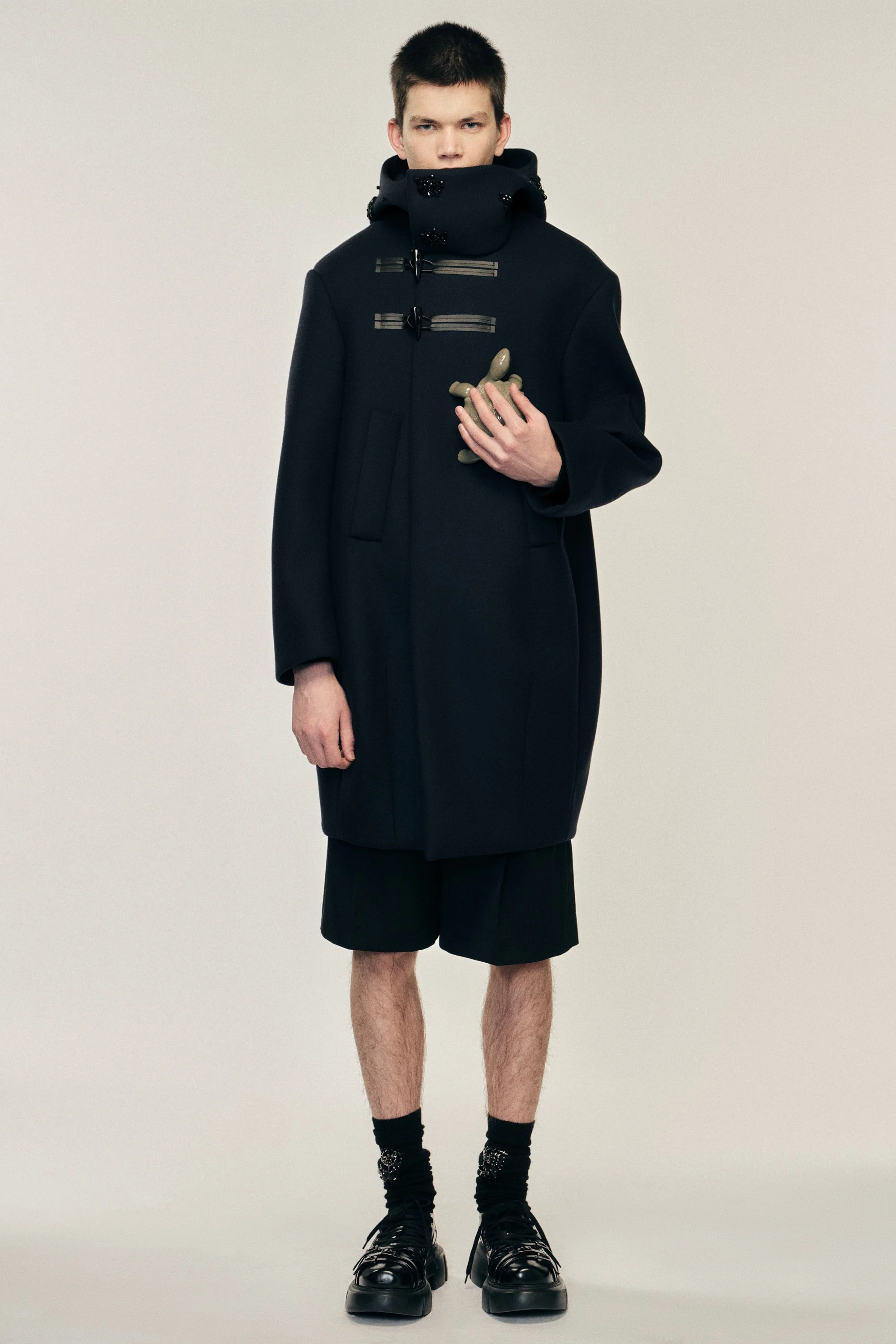 This bonded wool style is inspired by a classic duffle coat. It takes inspiration from the classic outerwear design, but reinterpreted with a hood and nautical inspired back flap with signature embellishments. Product Details Bonded wool duffle coat - From Look 32 on the runway - Signature embellishment - Offset toggle and snap button closure - Back flap detail - Welt pockets at side - Oversized fit Composition: 50% Virgin Wool 25% Polyester 13% Nylon 12% Polyurethane Lining: 75% Wool 20% Nylon 5% Cashmere (Excluding Embellishment) SKU: 2072B 1265 NAVY/JET Size & Fit Model is wearing size Small.