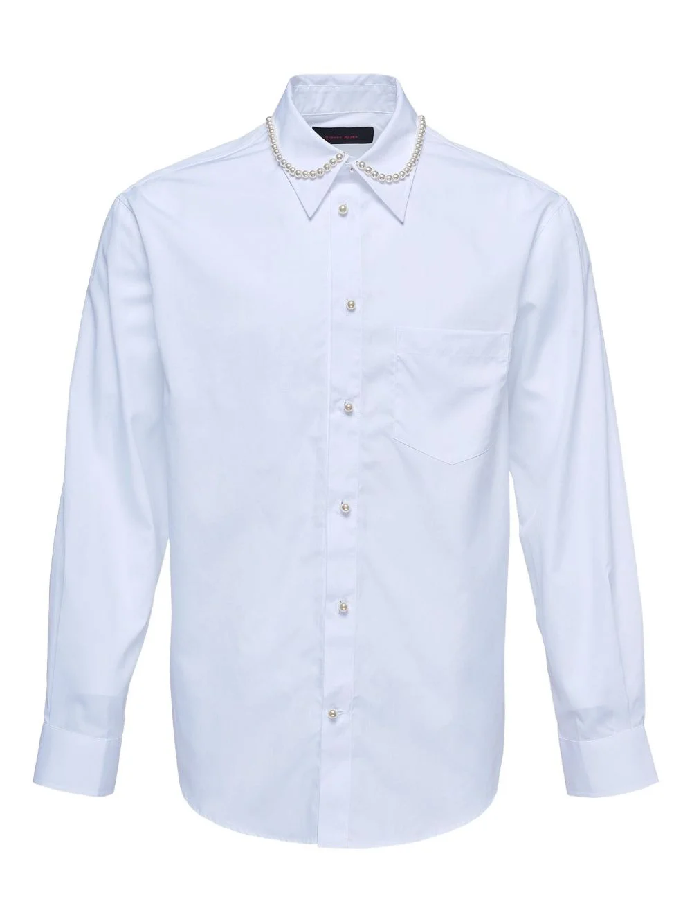 pearl-embellished collar shirt Highlights - White - Pearl embellishment - Long sleeves - Front button fastening - Classic collar - Chest pocket Imported Composition Cotton 100% Washing instructions Read Manufacturer Guidelines