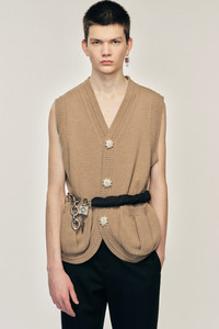 A classic merino wool knit vest cardigan, it features snap buttons embellished with faux pearls in the shape of a flower. It can be layered underneath a formal jacket or worn on its own for more casual styling. The model is wearing this style with the Cuffed Straight Leg Trousers. Product Details Virgin wool knit vest - From Look 29 on the runway - Faux pearl snap buttons - Relaxed fit Composition: 93% Merino Wool 6% Nylon 1% Elastane (Excluding Embellishment) SKU: LMK9B 0660 CAMEL/PEARL Size & Fit Model is wearing size Small.