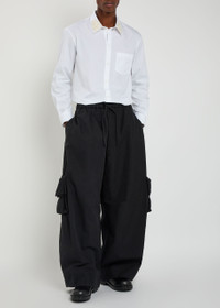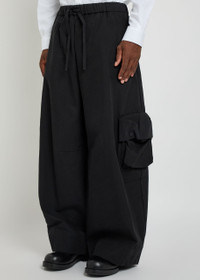 Info & Care Simone Rocha cotton-blend trousers Elasticated drawstring waist, side slip pockets, press-stud fastening flap pocket at sides and back Pull on 70% cotton, 30% polyamide; lining: 100% cotton Dry clean Size & Fit Inside leg length: 29 inches/ 73.5cm Midweight Wide, barrel-leg;cut Relaxed fit Model is 6'1"/ 185cm, chest size 38.5 inches and wears a size medium