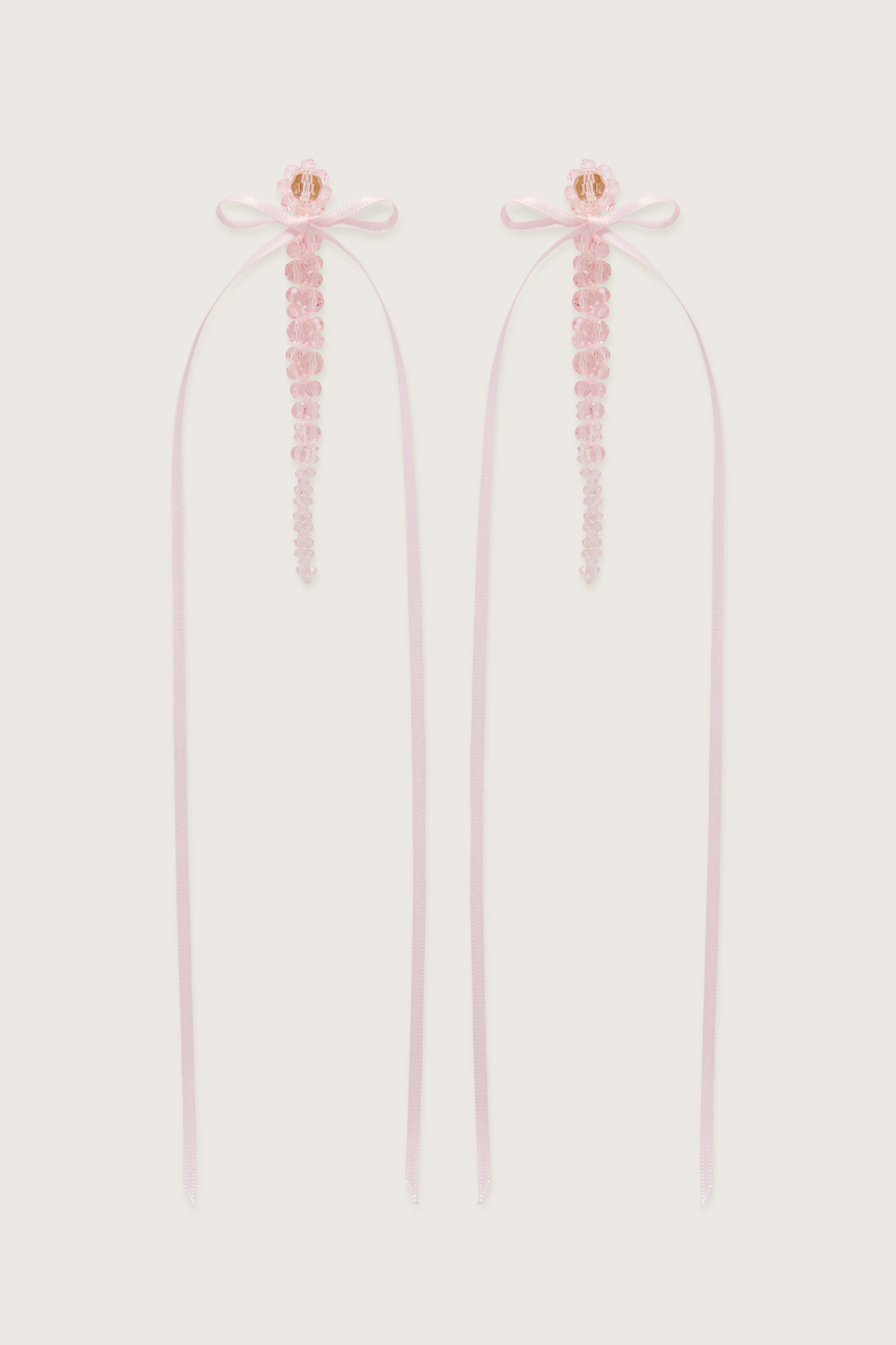 The classic drip earring paired with a slim bow ribbon, the crystals provide a luminous finish, adding a subtle, yet distinctive flair. Product Details Crystal drop earrings - Ribbon bow detail - Beaded daisy at base - Glass crystal beading Composition: 67% Crystal (Glass) Polyester 25% 8% Brass SKU: ERG410S 0903 PALE PINK