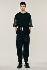 A t-shirt made of patchwork sleeves with different textures, adding a new elevated feel to this everyday piece. The model is wearing this style with the Ankle Zip Pocket Trousers. Product Details Cotton jersey patchwork t-shirt - Contrasting sleeve detail - Embroidered tonal logo at front - Relaxed fit Composition: Self: 100% Cotton Self 2: 100% Nylon Self 3: 100% Polyester Lining: 100% Viscose SKU: 5354 0553 BLACK/BLACK Size & Fit Model is wearing size Small.