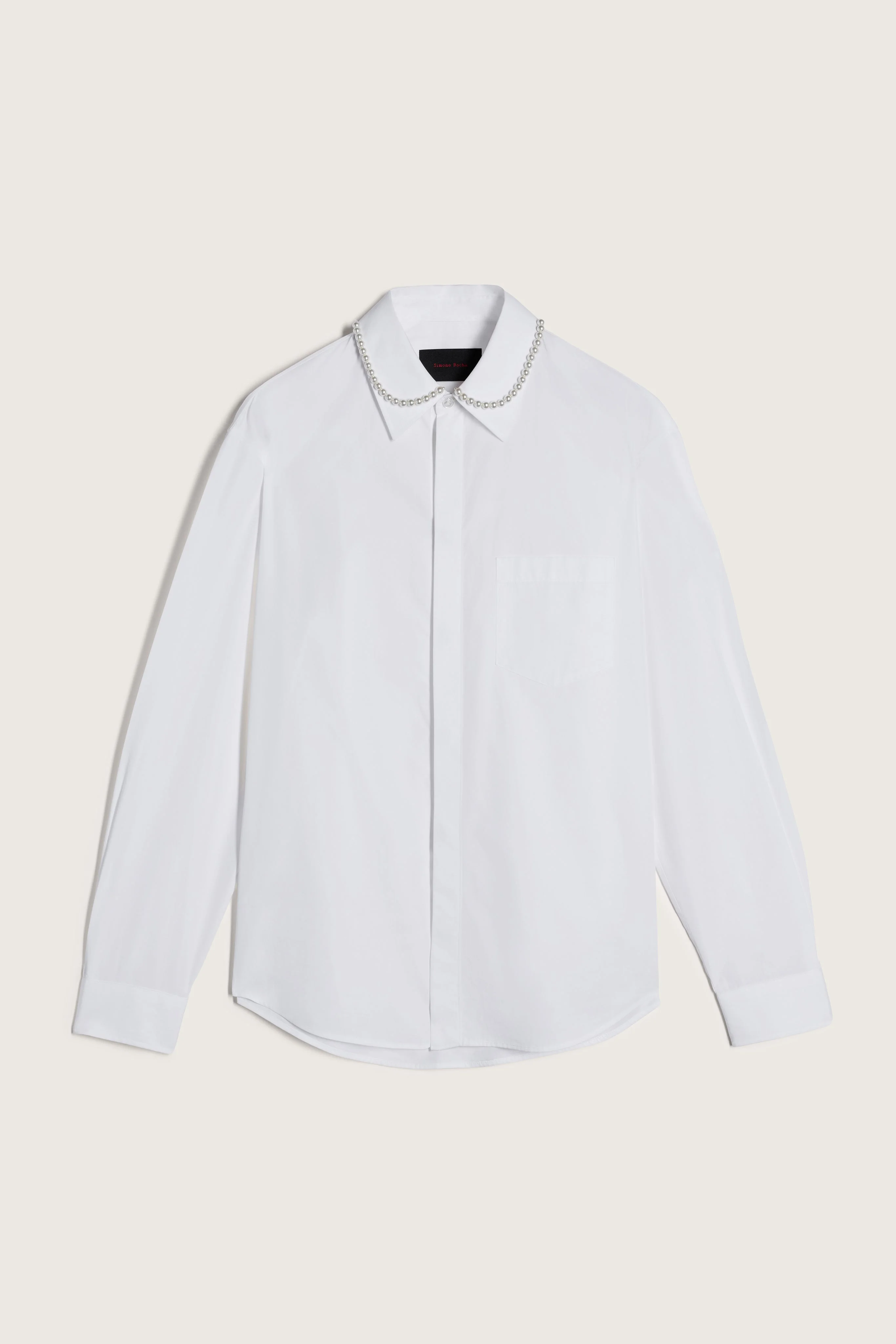 Classic dress shirt in crisp cotton poplin with a concealed button placket. Adorned with draped faux pearl strands at each collar. Product Details Cotton poplin button-up shirt - Seasonal embellishment - Concealed button placket Composition: SELF: 100% CO (EXCL. EMBELLISHMENT) SKU: 5423B 1287 WHITE/PEARL