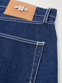 Simone Rocha updates wardrobe staples with eclectic design details - these 'Puddle' jeans, named after their wide, pooling hems, are embellished with crystals along the hammer loop and back label. They're cut from structured denim, traced with contrasting topstitching and pleated for a tailored feel. Large to size. See Size & Fit notes. Size & Fit - Fits large to size. Take one size smaller than normal - Wide leg, low-crotch style - Mid-weight, non-stretchy denim - Model is shown wearing a L - Model measures: waist size 32, height 6'0"/ 183cm Details & Care - Blue denim - Button and zip fastening - 100% cotton - Hand wash
