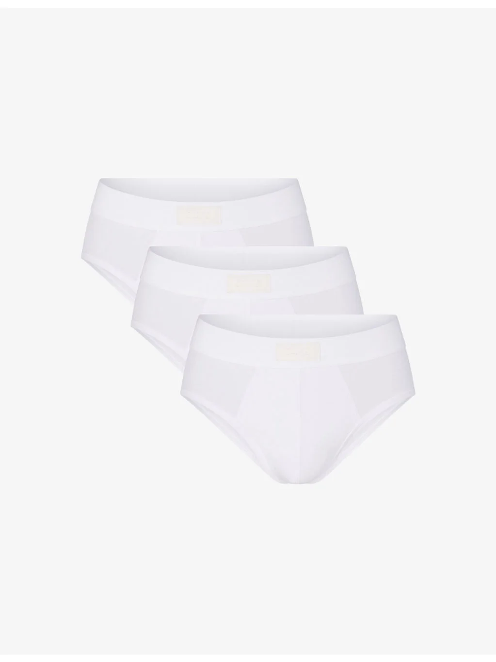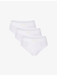 PRODUCT DETAILS - SKIMS pack of three stretch-cotton briefs - 43% cotton, 43% modal, 14% elastane - Pulls on - Mid-rise, elasticated waistband with jacquard brand logo, engineered pouch and gusset for comfort, clean seamlines for an invisible fit under clothing - Machine wash cold - Lightweight, stretchy - For hygiene reasons, we are unable to exchange or refund this product, unless faulty. Ref: R04371620