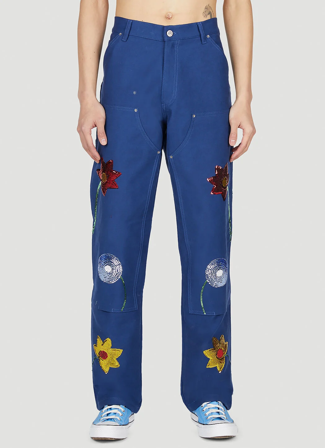 - Cotton in a denim weave - Mid-rise - Front button and fly fastenings - Side pockets - All-over embroidered motif - Rear pockets - Made in Italy - 100% Cotton. Machine wash - Color: Dark Blue - Code: SHF03P001 BLUE