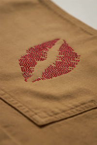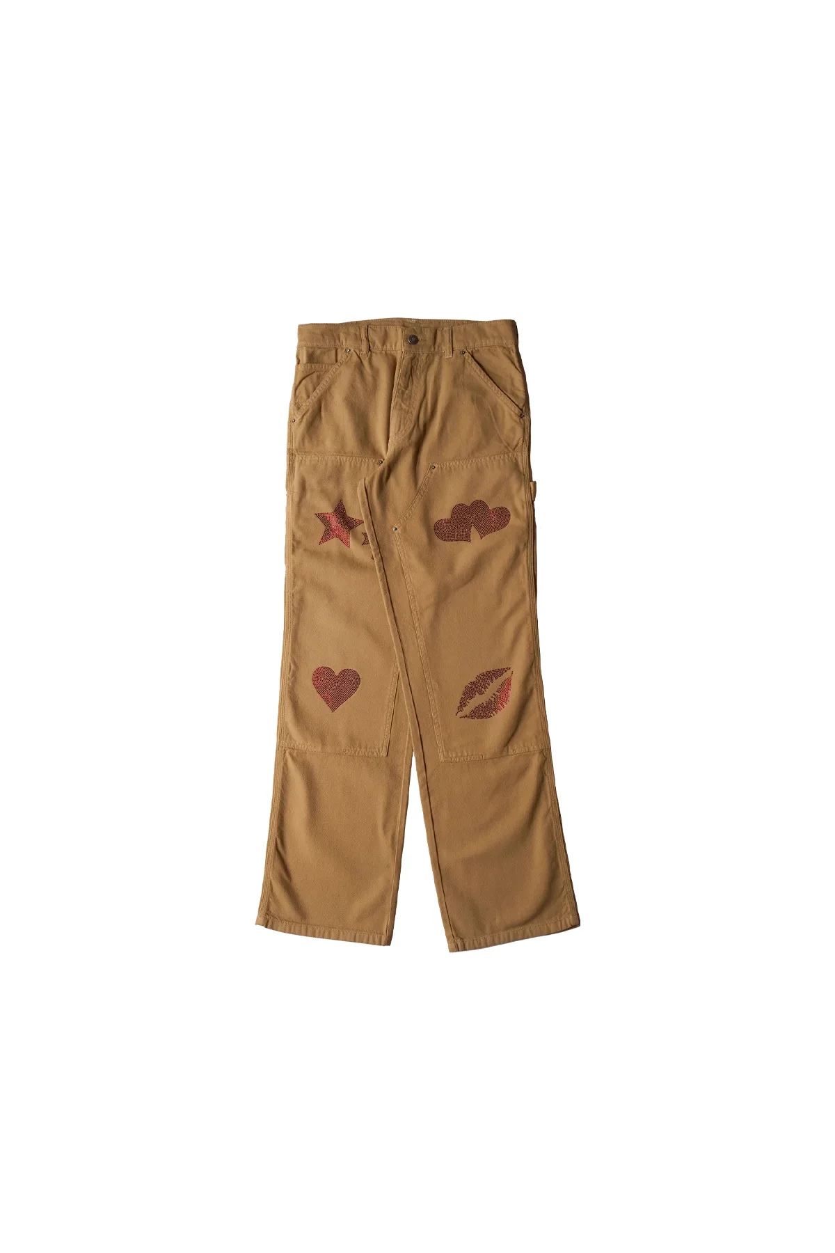 Sky High Farm SH4U five-pocket carpenter pants in deadstock cotton canvas featuring reinforced knees, and graphic crystal appliques by stylist Vanna Youngstein with large logo at back pocket. DETAILS - Crystal Artwork by Vanna Youngstein - Belt Loops - Five-Pockets - Zip-Fly - Crystal-Cut Embellishment at Legs - Panel Overlay at Knees - Hammer Loop at Outseam - Patch Pockets at Outseams - Crystal-Cut Logo Graphic at Back Pocket - Made in Tunisia Sizing: - True to size Material: 100% Cotton Product codes: - SKU: ESSX/SKH/SHF06P003/BGE/S - UPC: 2100002008931