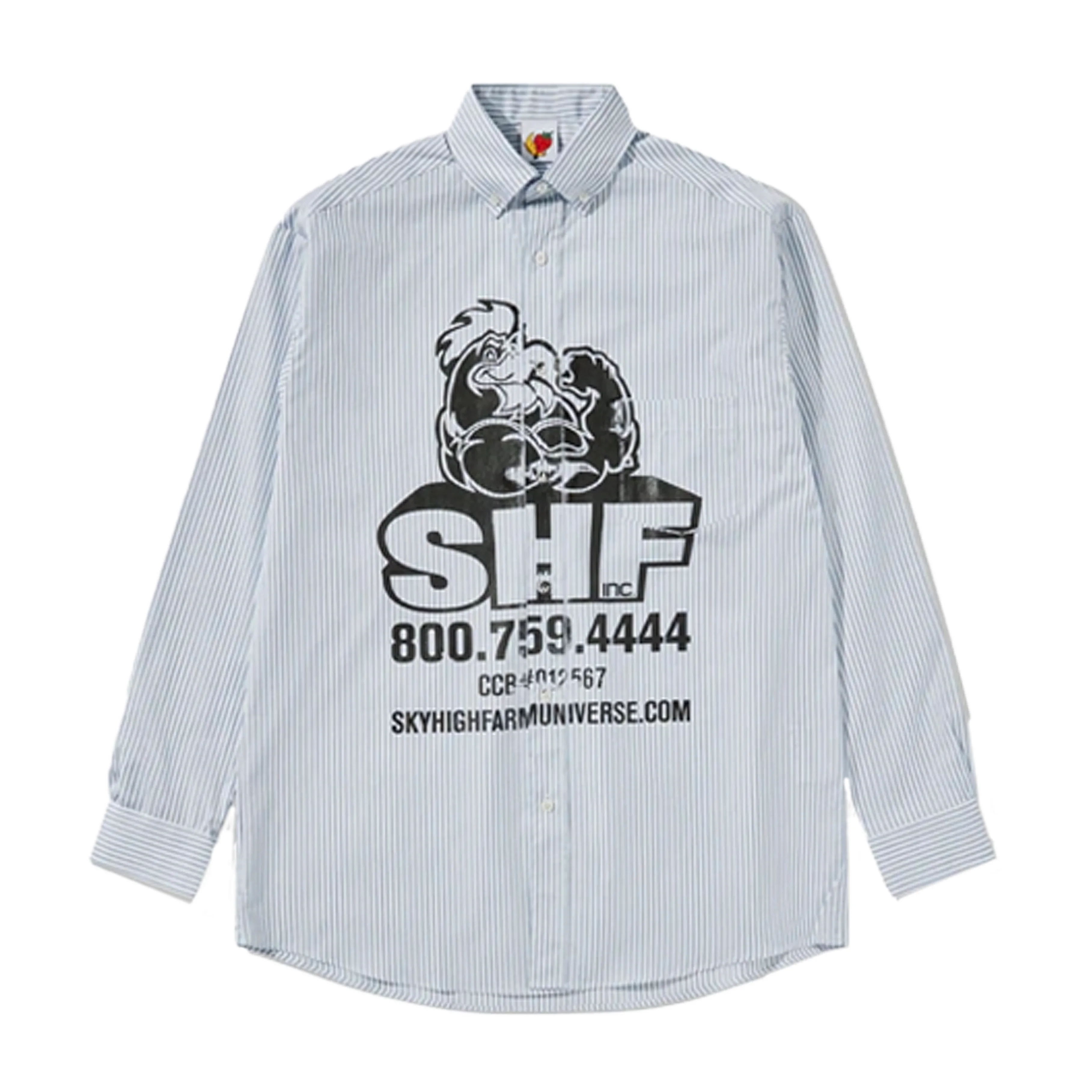 Sky High Farm Workwear Chicken Button Down oversized oxford striped shirt in deadstock cotton with spread collar, patch pocket at chest, and logo graphic printed at front created by stylist Vanna Youngstein. This item is final sale and is not eligible for return or exchange. DETAILS - Deadstock cotton - Oversized oxford shirt - Stripes throughout - Spread collar - Chest patch pocket - Button closure - Logo graphic printed at front - Shirttail hem - Single-button barrel cuffs - Box pleat at back yoke Sizing: - True to size Material: Deadstock Cotton Made in France Product codes: - SKU: ESSX/SHF/SHF05B005/BLU/S - UPC: 2100001911362