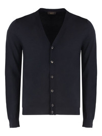 button V-neck cardigan Highlights - Dark blue - Button closure - V-neck - Long sleeves Made in Italy Composition Virgin Wool 95%, Polyamide 5% Washing instructions Read Manufacturer Guidelines
