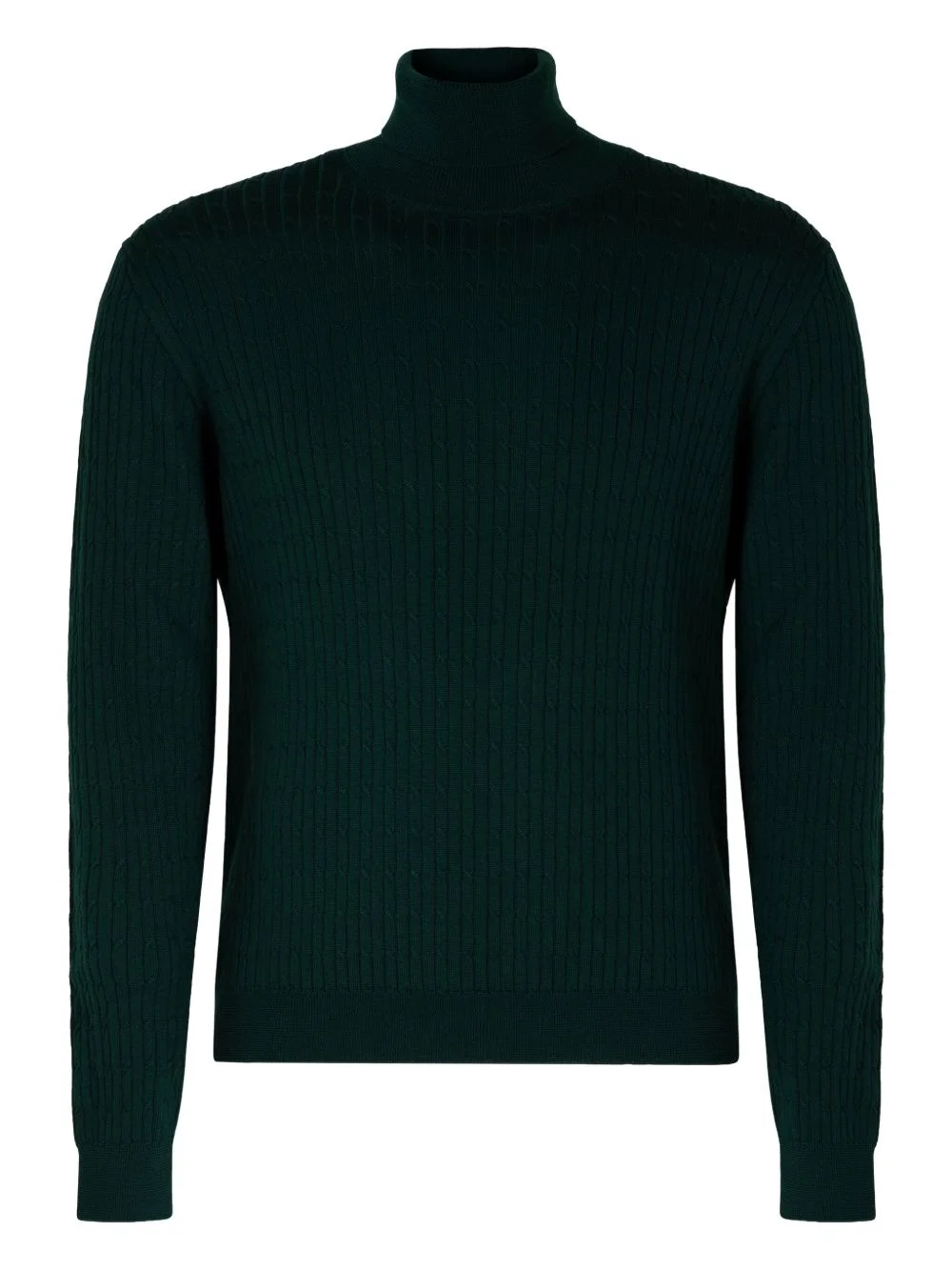 cable-knit turtleneck sweater Highlights - Dark green - Turtleneck - Cable knit - Ribbed knit edges - Long sleeves - Ribbed cuffs Made in Italy Composition Virgin Wool 100% Washing instructions Read Manufacturer Guidelines