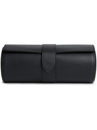 Panama leather 3-watch roll The British brand Smythson presents its 'Panama' collection, combining hardwearing cross-grain leather with a heritage-inspired design. Based on the texture of leather used in the famous Panama diary, the material reappears in the construction of this watch roll, paired with nubuck lining and a removable pad for practical storage. Highlights - Black - Calf leather - Gold-tone logo lettering - Removable pads - Foldover top with magnetic fastening - Suede lining - Holds 3 watches Made in Italy SIZE & FIT Measurement HEIGHT 3.14 in(8 cm) WIDTH 7.87 in(20 cm)