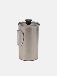 Crafted in Japan from titanium using a historic manufacturing process, this French Press elevates coffee whether at home or outdoors. Its single-wall titanium body can be placed directly over a heat source to boil water, simplifying brewing. Lightweight, durable, and corrosion-resistant, it combines practicality with refined craftsmanship. Perfect for coffee enthusiasts seeking a minimalist, versatile solution. DETAILS - CS-111 - Pot & Lid: Titanium - Press: Stainless Steel - Knob: Plastic - Foldable handle - 24 fl oz capacity - 6.3 (200g) oz weight - Mesh bag included - Made in Japan