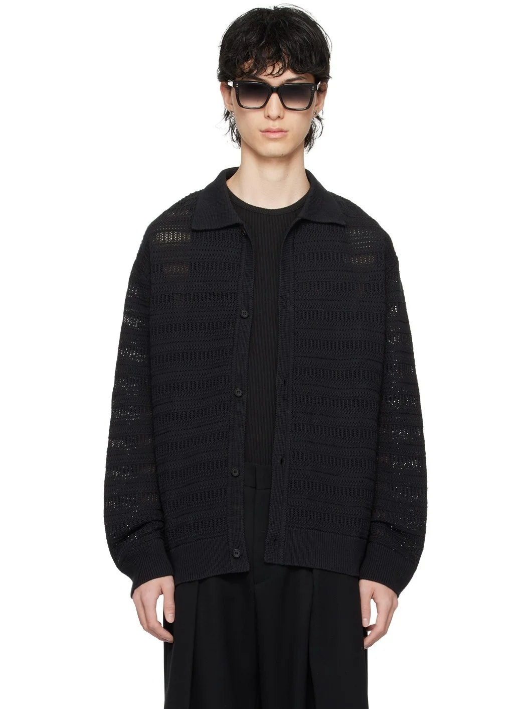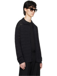 Crocheted cotton- and nylon-blend cardigan. · Rib knit spread collar, hem, and cuffs · Button closure Supplier color: Black 70% cotton, 30% nylon. Made in South Korea 241221M212006