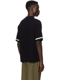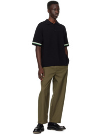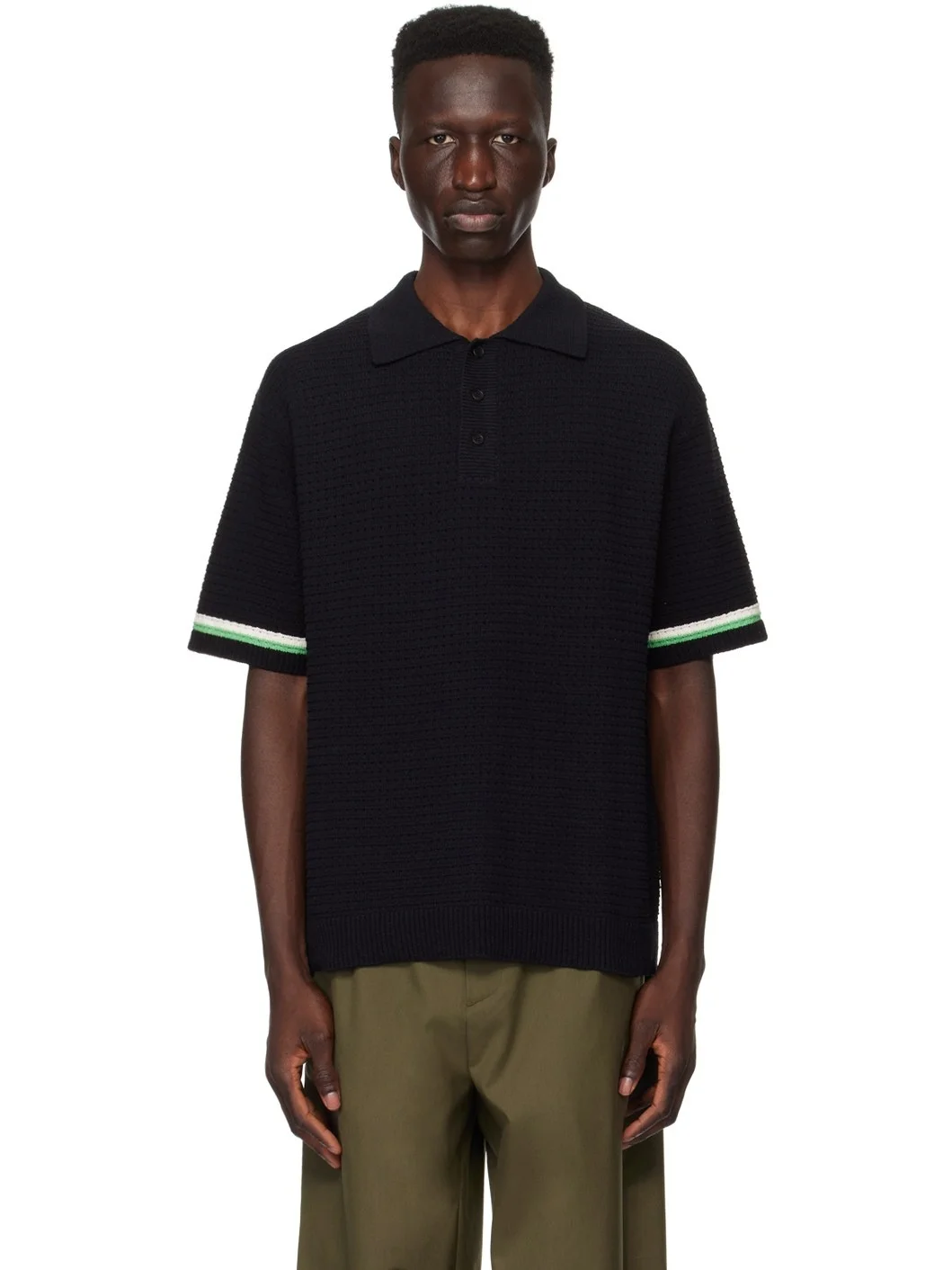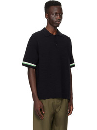 Knit stretch cotton- and nylon-blend polo. · Rib knit spread collar, hem, and cuffs · Three-button placket · Intarsia stripes at cuffs Supplier color: Black 77% cotton, 22% nylon, 1% spandex. Made in South Korea 241221M212004