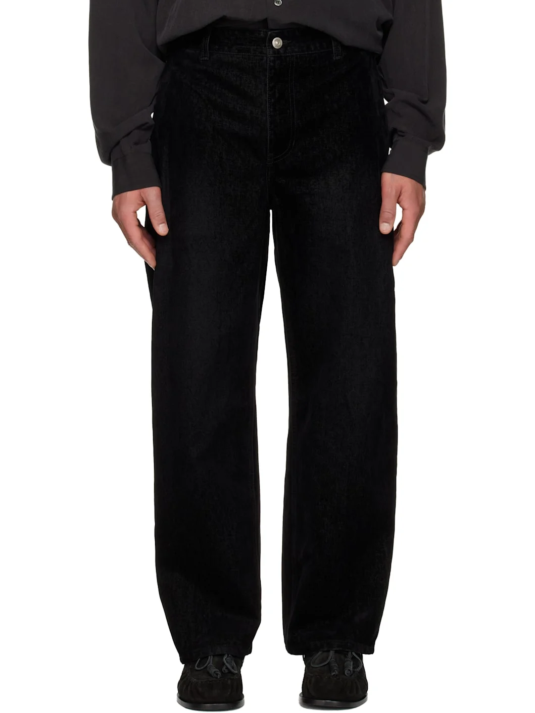 Flocked non-stretch denim jeans. · Belt loops · Four-pocket styling · Zip fly · Logo patch at back waistband Supplier color: Black Body 1: 100% cotton. Body 2: 100% rayon. Made in South Korea 252221M186006