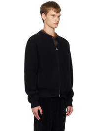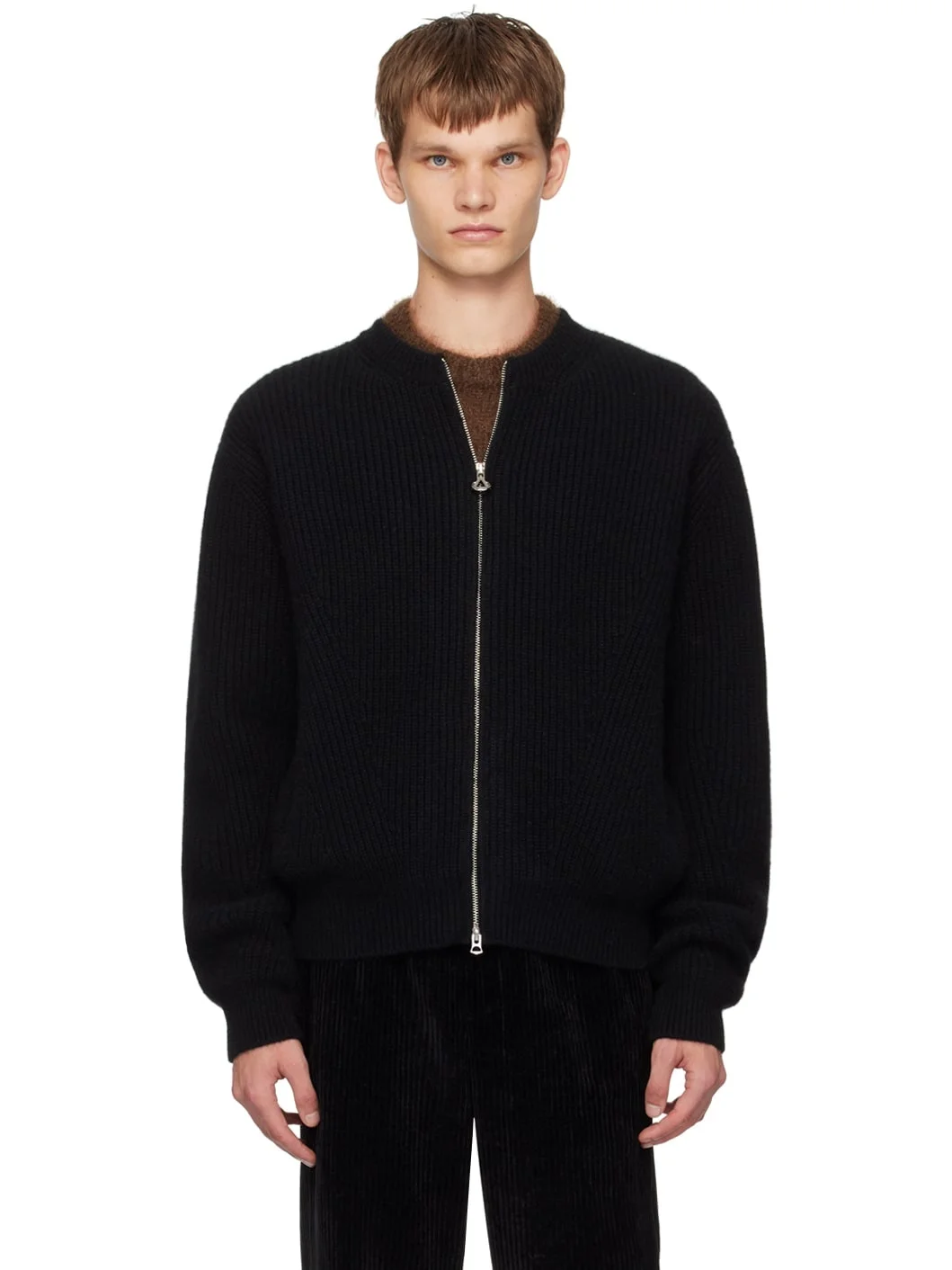 Brushed rib knit nylon- and wool-blend sweater. · Crewneck · Two-way zip closure · Seam pockets · Pinched side seams · Dropped shoulders · Logo-engraved silver-tone hardware Supplier color: Black 43% nylon, 29% wool, 28% raccoon. Made in South Korea 242221M202007