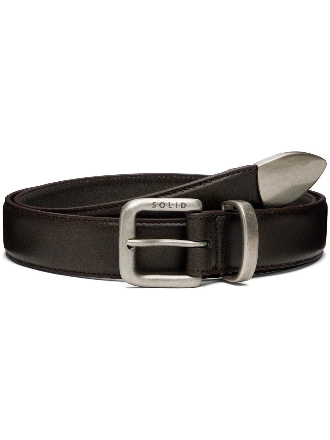 Buffed leather belt. · Metal keeper loop · Pin-buckle fastening · Hardware at end · Antiqued silver-tone hardware · W1" Supplier color: Brown 100% leather. Made in South Korea 252221M131000
