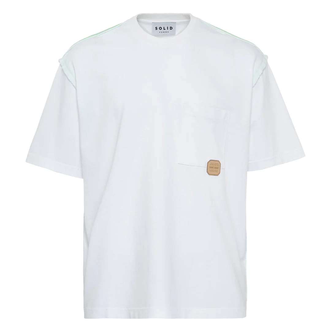 600079121WHT046 / S261TS67/00/312W - Pre-washed cotton construction - Contrasting green shoulder trim - Leather brand patch detail - Short sleeves - Crew neckline - Oversized relaxed fit SOLID HOMME Washed T-Shirt delivers contemporary Korean menswear with relaxed urban styling. Crafted from pre-washed cotton with a soft, lived-in feel and featuring distinctive green shoulder trim detailing. The oversized fit and signature leather brand patch create a modern statement piece for everyday wear.