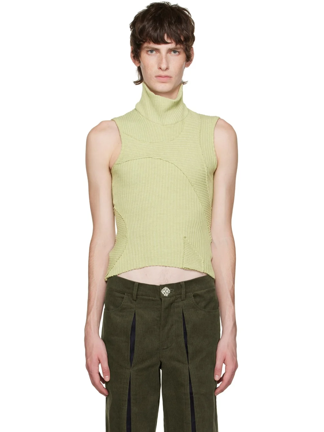 Rib knit stretch cotton tank top. Raw edges and graphic overlays throughout. · Layered construction · Rib knit rolled turtleneck and armscyes · Eyelets at front and back · Silver-tone hardware Available exclusively at SSENSE. Supplier color: Kiwi 60% cotton, 30% polyester, 5% elastane. Made in Denmark 222787M214003