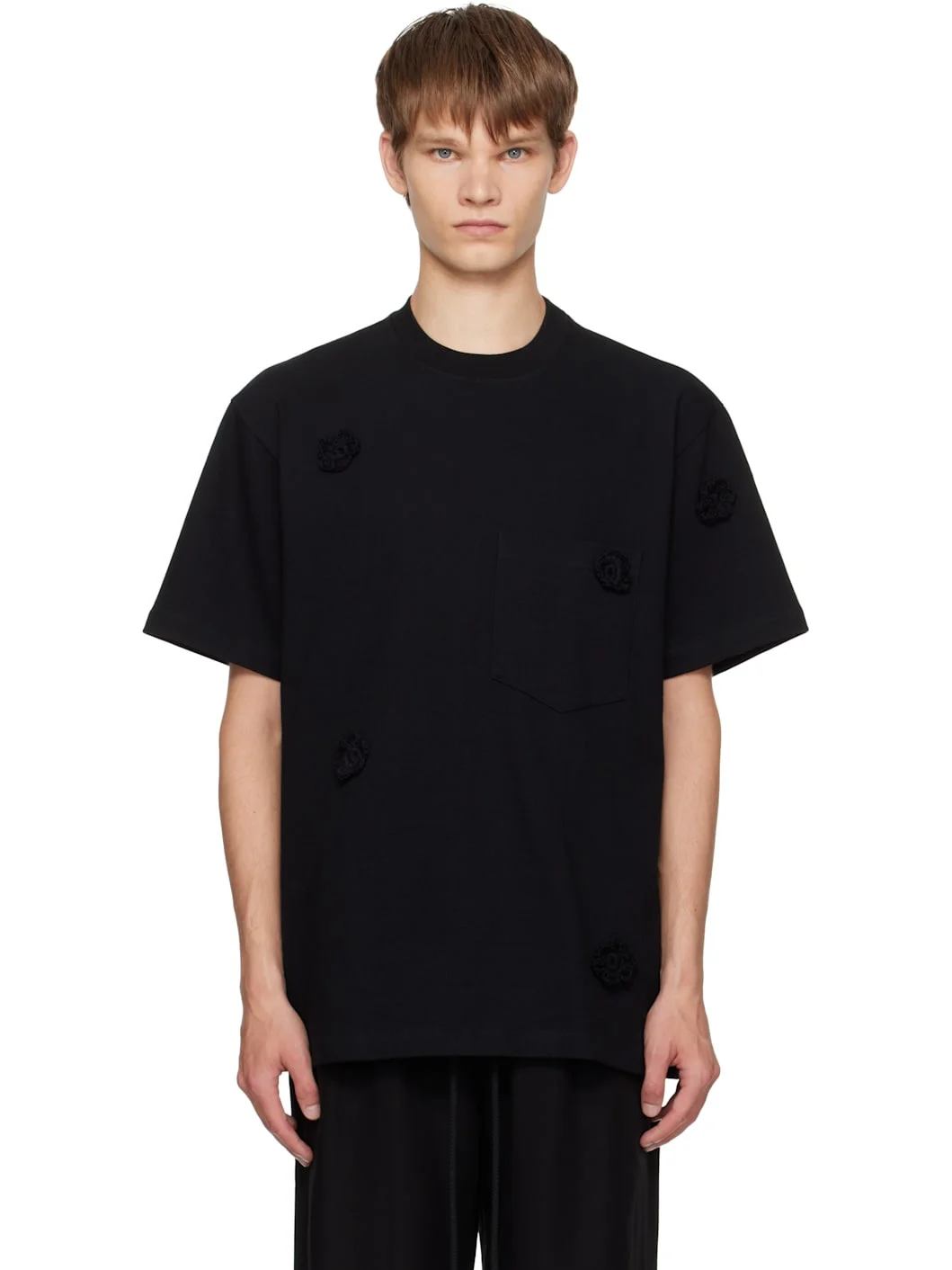 Cotton jersey T-shirt. · Crocheted floral appliques throughout · Rib-knit crewneck · Patch pocket at chest Supplier color: Black 100% cotton. Made in India 252699M213005