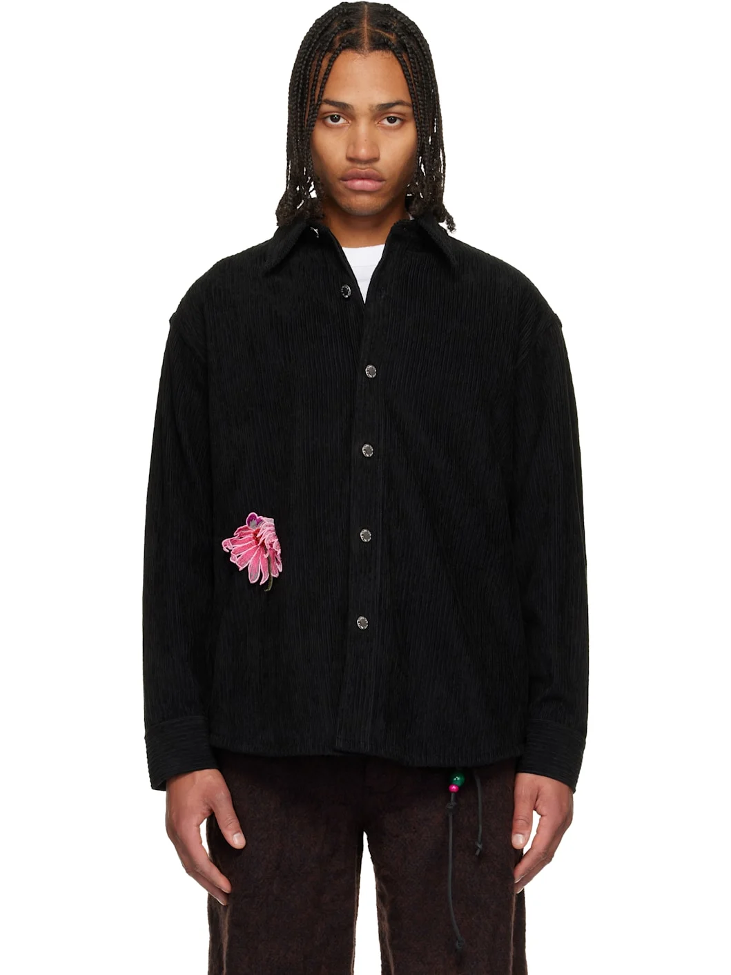 Stretch corduroy overshirt. · Spread collar · Button closure · Beaded floral applique at front and back · Shirttail hem · Dropped shoulders · Buttoned barrel cuffs · Leather logo patch at back · Unlined · Logo-engraved silver-tone hardware Supplier color: Black Body: 52% polyester, 29% cotton, 18% modal, 1% polyurethane. Trim 1: 100% nylon. Trim 2: 100% polyester. Lining: 100% cupro. Made in Australia 252699M180002