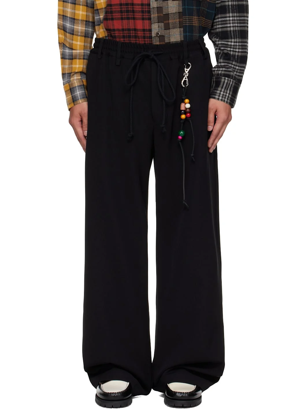Wide-leg gabardine trousers. · Drawstring and belt loops at elasticized waistband · Detachable beaded leather keychain at front belt loop · Four-pocket styling · Button fly · Leather logo patch at back waistband Supplier color: Black Body: 100% polyester. Pocket lining: 100% cotton. Made in Australia 252699M191004