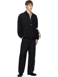 Wool-blend gabardine jacket. · Spread collar · Two-way zip closure with beaded pull-tab · Welt pockets at waist · Elasticized hem and cuffs · Loops and check pattern printed trim at sleeve · Logo patch at back hem · Partial cupro satin lining Supplier color: Black Body: 50% polyester, 50% wool. Trim: 75% rayon, 25% polyester. Lining: 100% cupro. Made in Australia 252699M180000