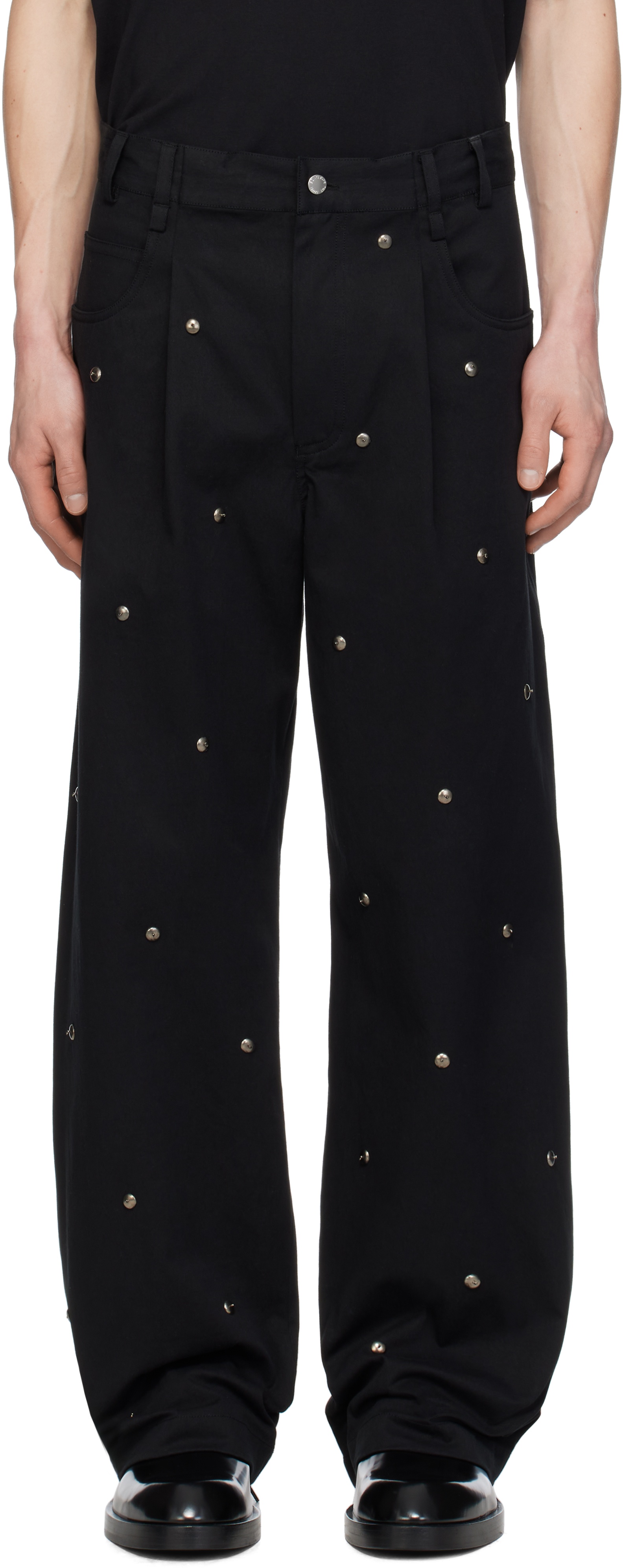 Loose-fit non-stretch denim jeans. · Belt loops · Five-pocket styling · Zip fly · Pleats at front · Studs with glass beads at front · Logo-engraved silver-tone hardware Supplier color: Black Body: 100% cotton. Lining: 100% cotton. Made in India 251699M186000